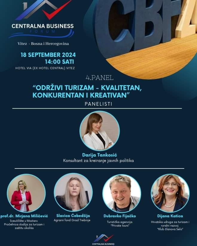 U Vitezu je prošli tjedan održan Centralna Business Forum na kojem je prisistvovala i predsjednica Hrvatske udruge za turizam i ruralni razvoj „Klub članova Selo“ Dijana Katica, koja je zajedno s kolegama Mirjanom Miličević, Maxom Dubravkom Fijackom i Slavicom Ćebedžija aktivno sudjelovala na panel raspravi „Održivi turizam – kvalitetan, konkurentan i kreativan“.