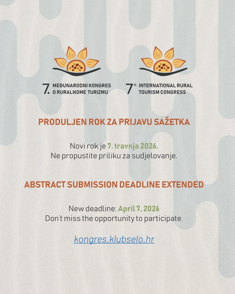 Zbog velikog interesa i upita potencijalnih sudionika, Organizacijski odbor 7. Međunarodnog kongresa o ruralnome turizmu donio je odluku o produljenju roka za dostavu sažetaka.